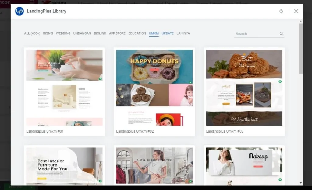 Nikmati akses ke lebih dari 400+ template landing page yang mencakup berbagai jenis bisnis online dan lainnya, membantu Anda menghemat waktu dalam membangun halaman yang menarik pelanggan anda.