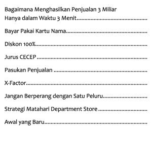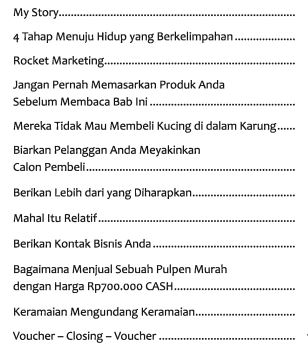 Buku setebal 147 halaman yang akan mengubah mindset Anda terhadap uang dan bagaimana menang atas keuangan serta trik-trik marketing untuk meningkatkan Omzet Anda.